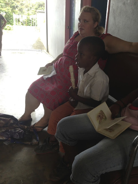 Poor Calvin was terrified. He didn't speak a word and wouldn't even smile. Usually I can get at least a little half smile out of him, but today I could tell he was not having it. Then his mother says, "Today is his birthday. He is 7." And I'm thinking, wow. What a crappy way to spend your birthday! We tried to distract him from the screaming children. He was growing visibly agitated with every passing minute. Wringing his hands, swinging his legs. Elise brought out a few books which distracted him briefly and then the kid would start crying again and he'd be back to wringing those little hands. Then I remembered that I had a recorder (a plastic flute/clarinet looking thing for those of you who don't know) in my backpack (can you tell I'm a music teacher?). What kid doesn't love a noise-maker?? So I pull it out and hand it to him and tell him to blow it. He timidly puts a little puff of air through the mouthpiece and it lets out a little whistle. And his little face lights up like the 4th of July. Finally that sweet little Calvin smile emerges! So he sneakily lets out a few more little whistles on the recorder and seems to be adequately distracted. Though even the best toy would have a hard time distracting from those sad little screams coming from our snaggle toothed friend. Even poor Elise was disturbed o_0